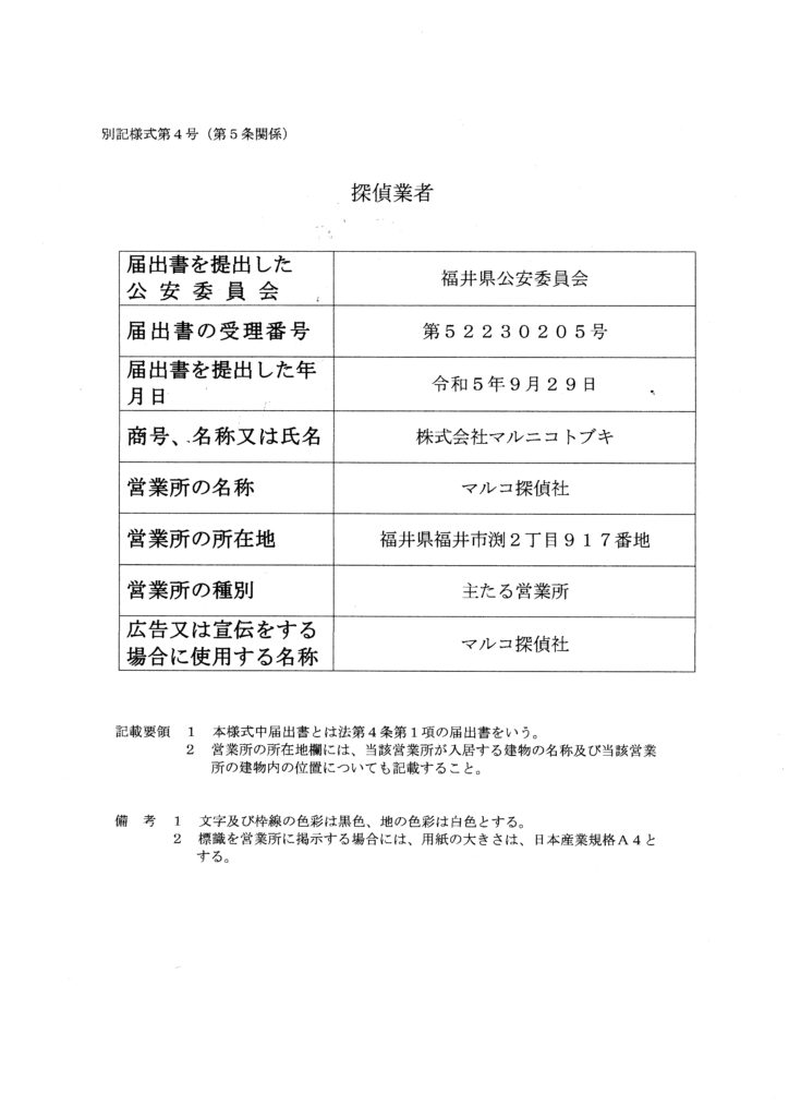 | 探偵業届出証明書 | 第52230205号 |